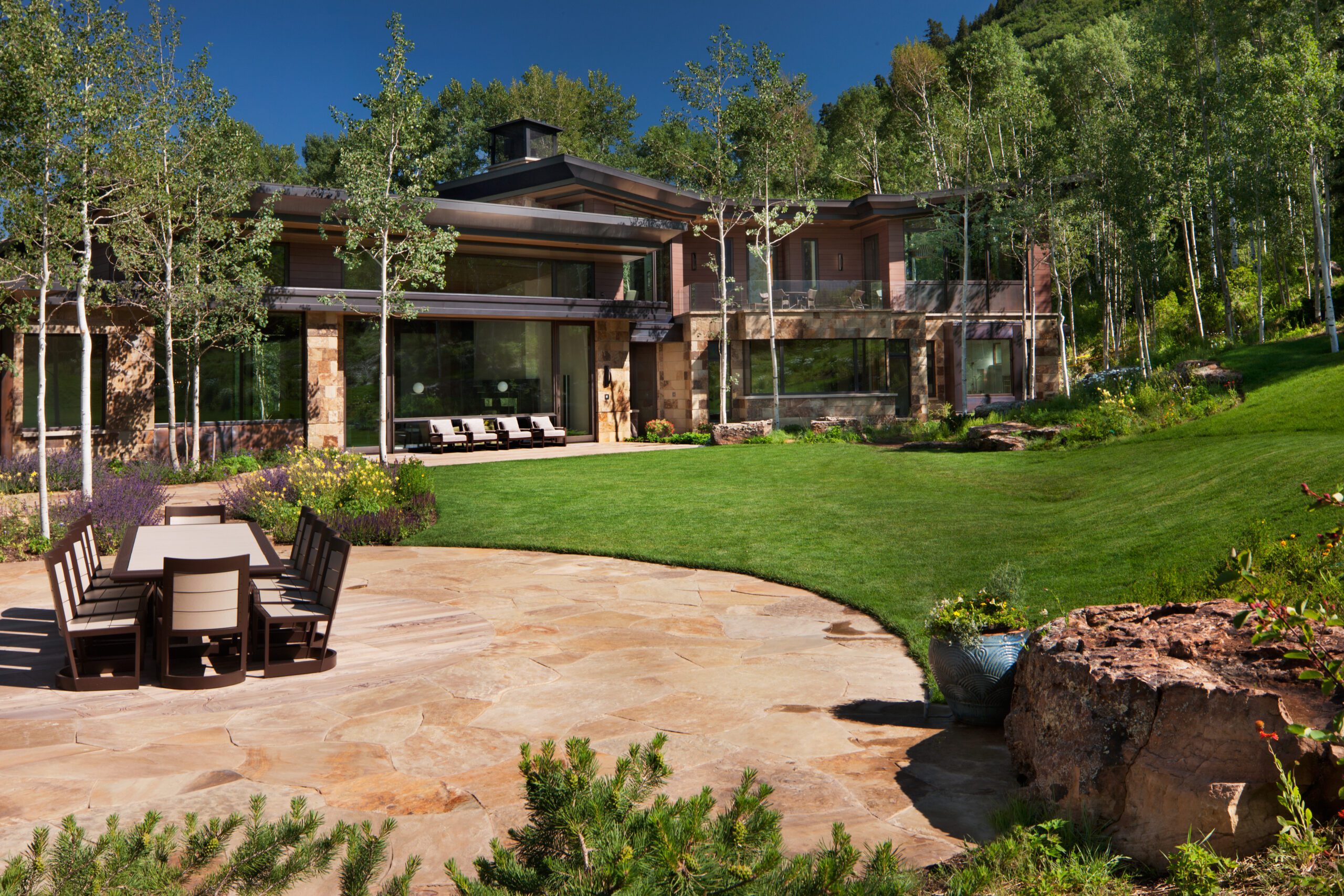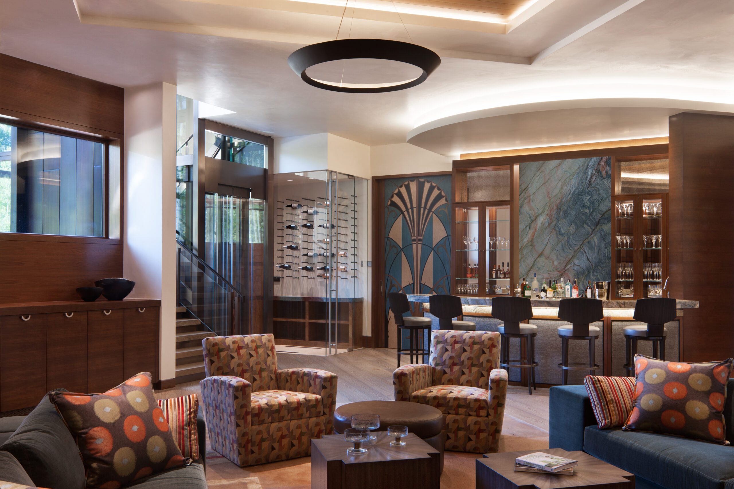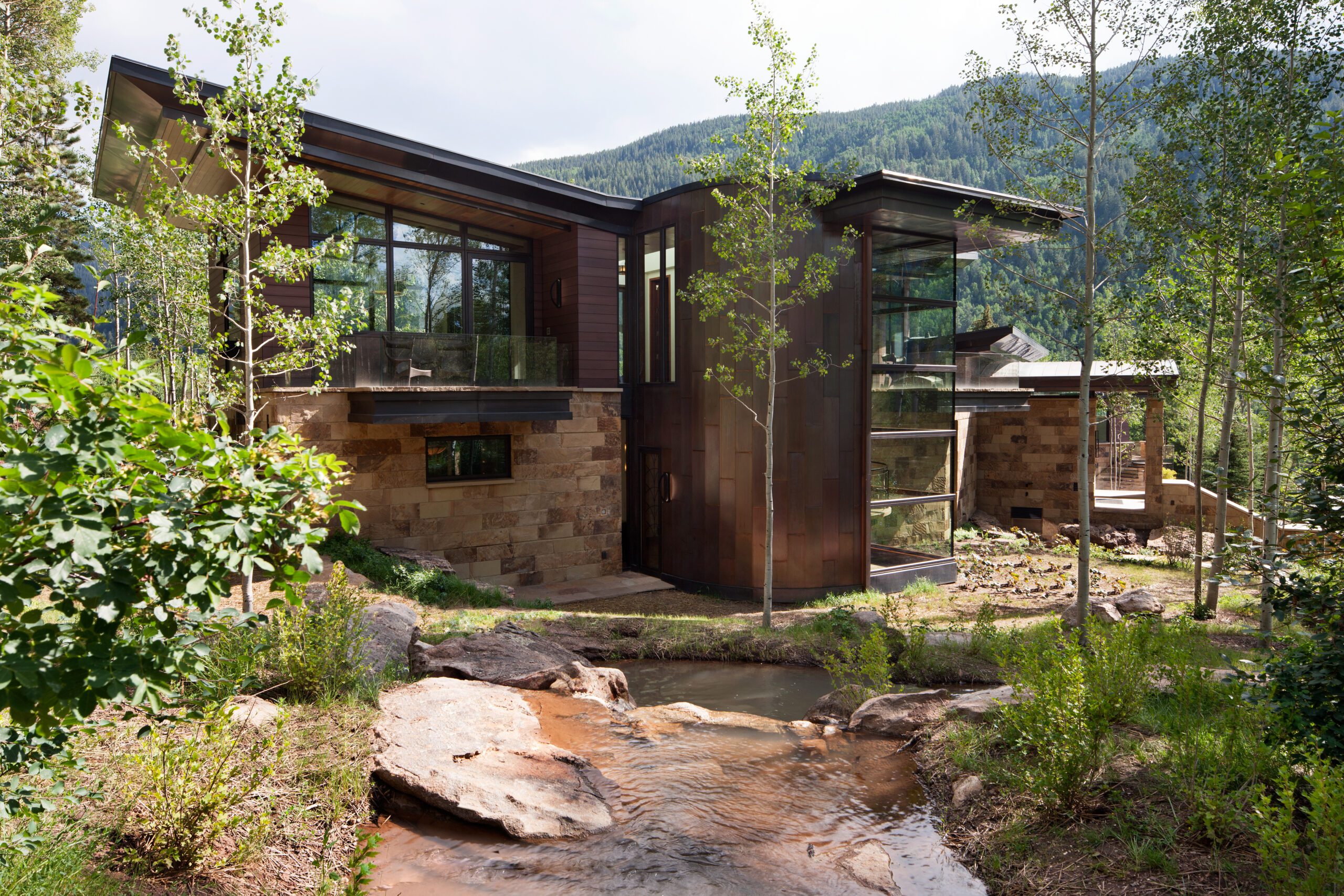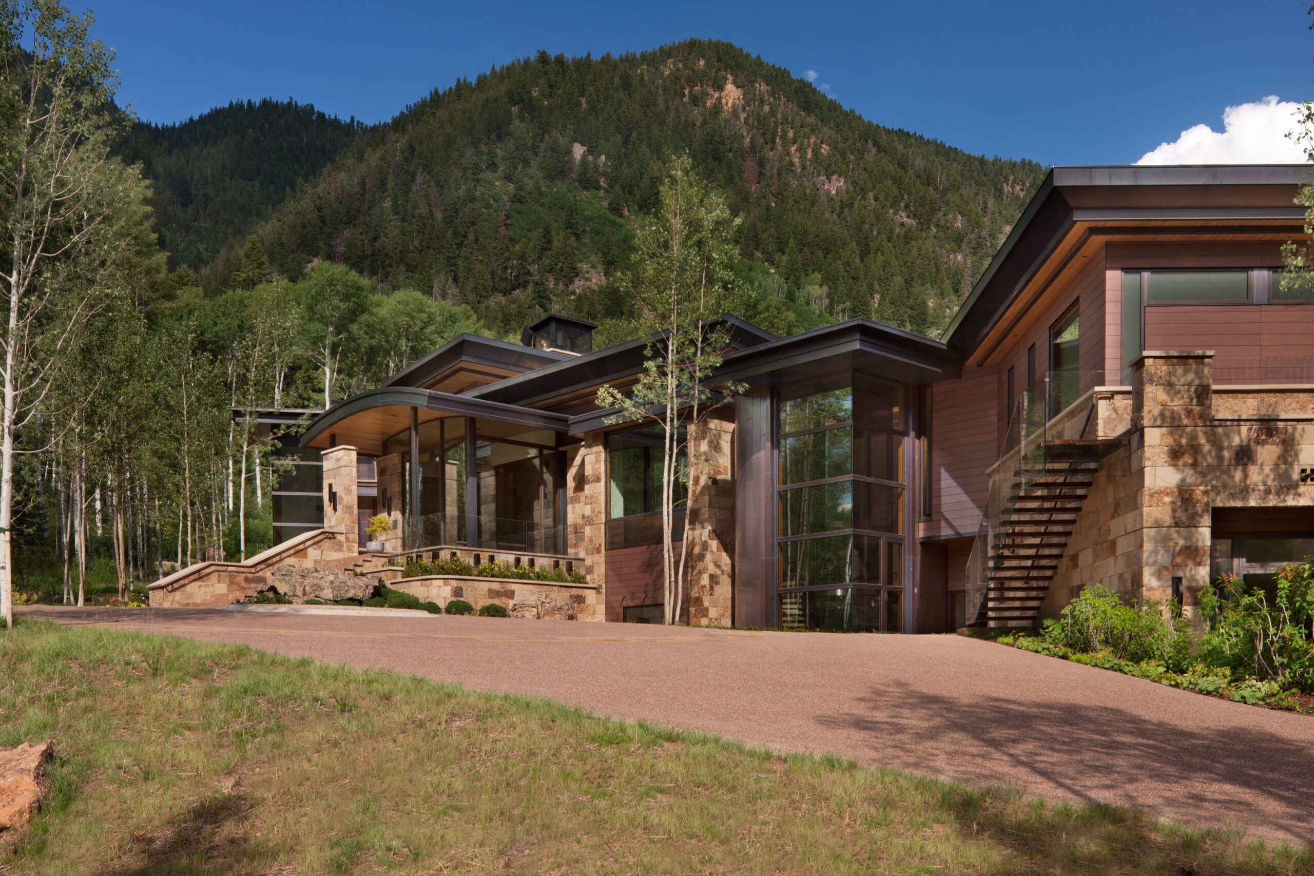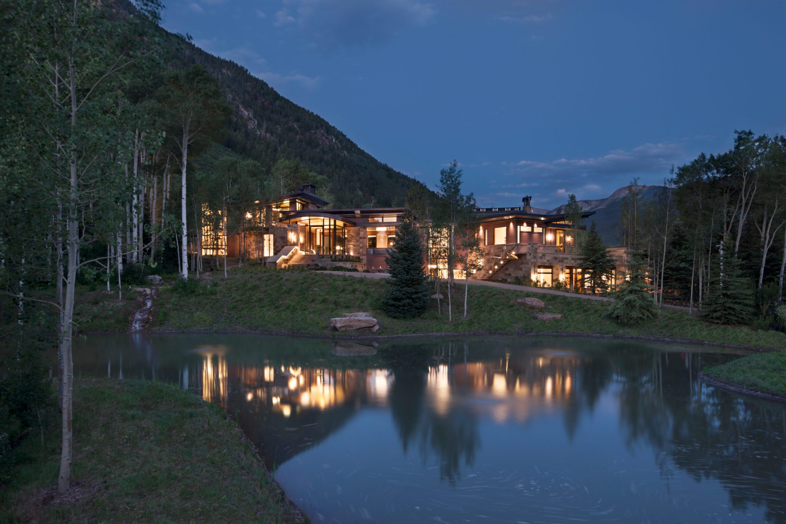 Project Information: The 15,000 SF main residence is built into the South Aspen hillside. It boasts exceptional views of Independence Pass and the backside of Aspen Mountain. The adjoining guest lot is parklike with meandering streams and trout-stocked ponds. This art deco-inspired modern retreat was designed by Charles Cunniffe of Aspen, CO. The exterior finishes include solid walnut windows and doors cladded in true bronze. The rainscreen consists of a composite material made from rice husks, and the stone veneer is dimensionally-cut Oklahoma brown fieldstone. The wood-like swirled sandstone that carefully dresses the expansive entry is cut from large boulders sourced out of the Ozark Mountains. The interior finishes include patinaed stainless steel accents throughout with wide plank wire-brushed and waxed oak flooring. There are 36 different wood species throughout including rare East Indian rosewood, cathedral-cut walnut, silver-dyed lacewood, ribbon sapele, palladium leaf, ebony, and even white walnut. The two custom stainless and curved glass elevators are the show pieces of the residence, each traveling a single floor via a stainless steel hydraulic piston that comes out of the ground. The fireplaces are 350,000 BTU custom stainless burners with traditional masonry flue assemblies. The landscape includes over an acre of fish-stocked ponds and meandering streams.