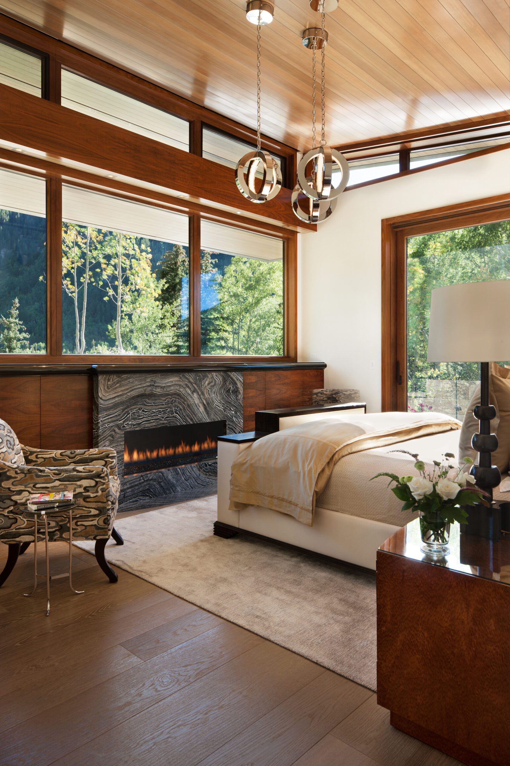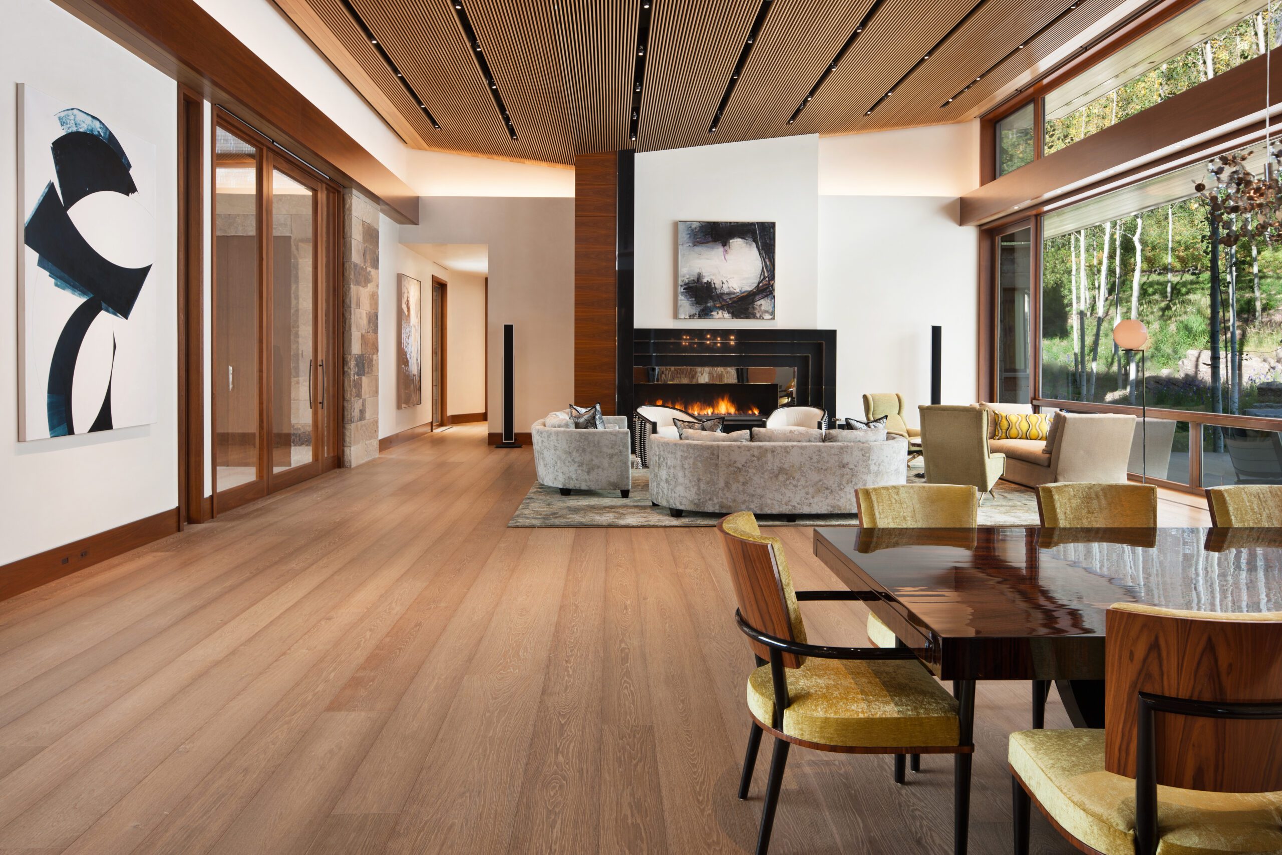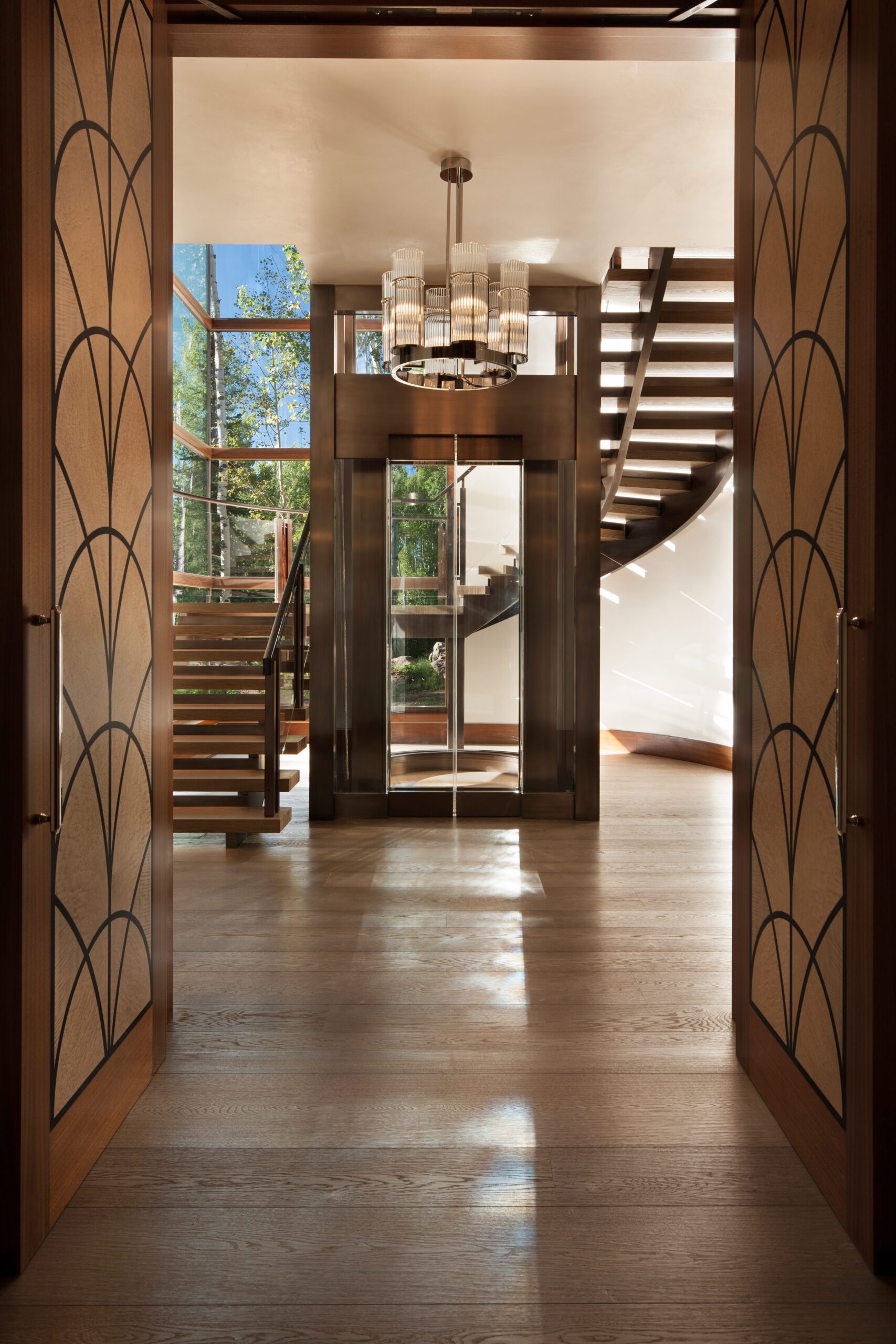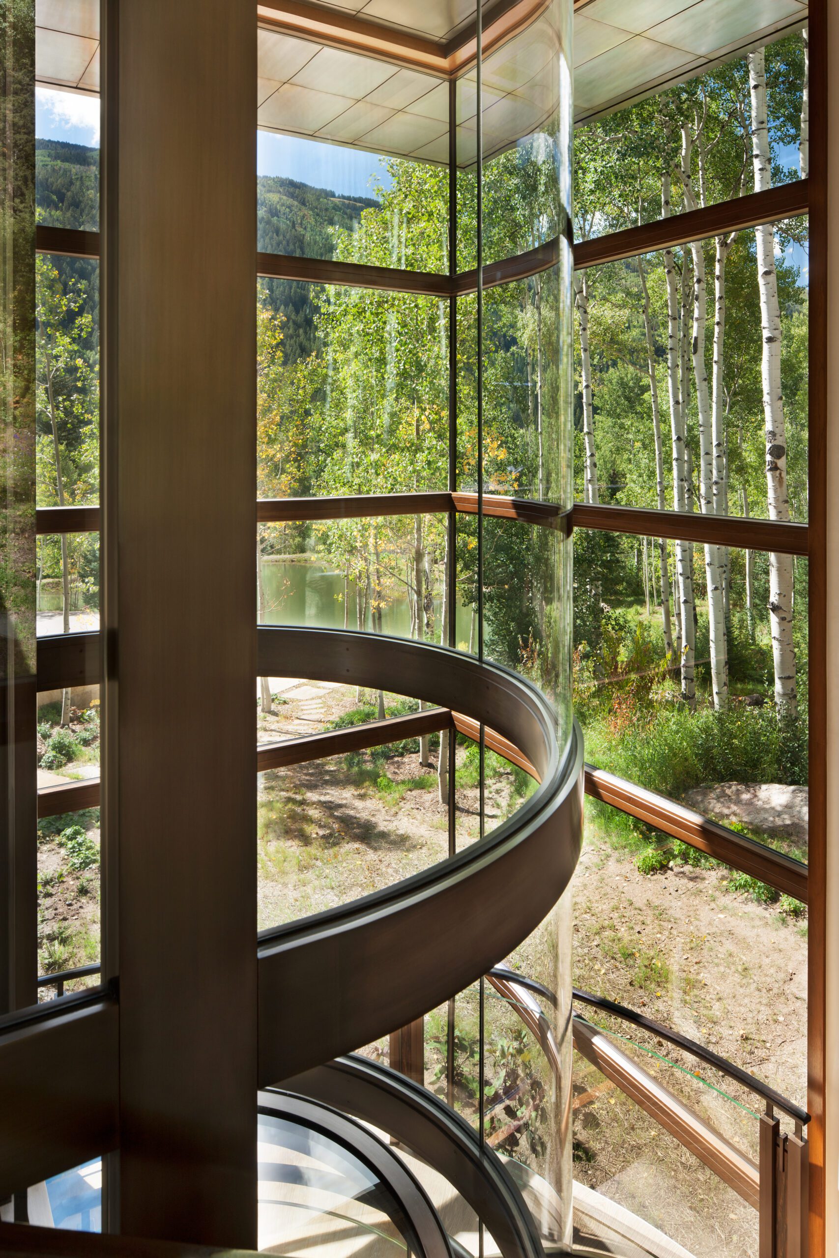 Project Information: The 15,000 SF main residence is built into the South Aspen hillside. It boasts exceptional views of Independence Pass and the backside of Aspen Mountain. The adjoining guest lot is parklike with meandering streams and trout-stocked ponds. This art deco-inspired modern retreat was designed by Charles Cunniffe of Aspen, CO. The exterior finishes include solid walnut windows and doors cladded in true bronze. The rainscreen consists of a composite material made from rice husks, and the stone veneer is dimensionally-cut Oklahoma brown fieldstone. The wood-like swirled sandstone that carefully dresses the expansive entry is cut from large boulders sourced out of the Ozark Mountains. The interior finishes include patinaed stainless steel accents throughout with wide plank wire-brushed and waxed oak flooring. There are 36 different wood species throughout including rare East Indian rosewood, cathedral-cut walnut, silver-dyed lacewood, ribbon sapele, palladium leaf, ebony, and even white walnut. The two custom stainless and curved glass elevators are the show pieces of the residence, each traveling a single floor via a stainless steel hydraulic piston that comes out of the ground. The fireplaces are 350,000 BTU custom stainless burners with traditional masonry flue assemblies. The landscape includes over an acre of fish-stocked ponds and meandering streams.