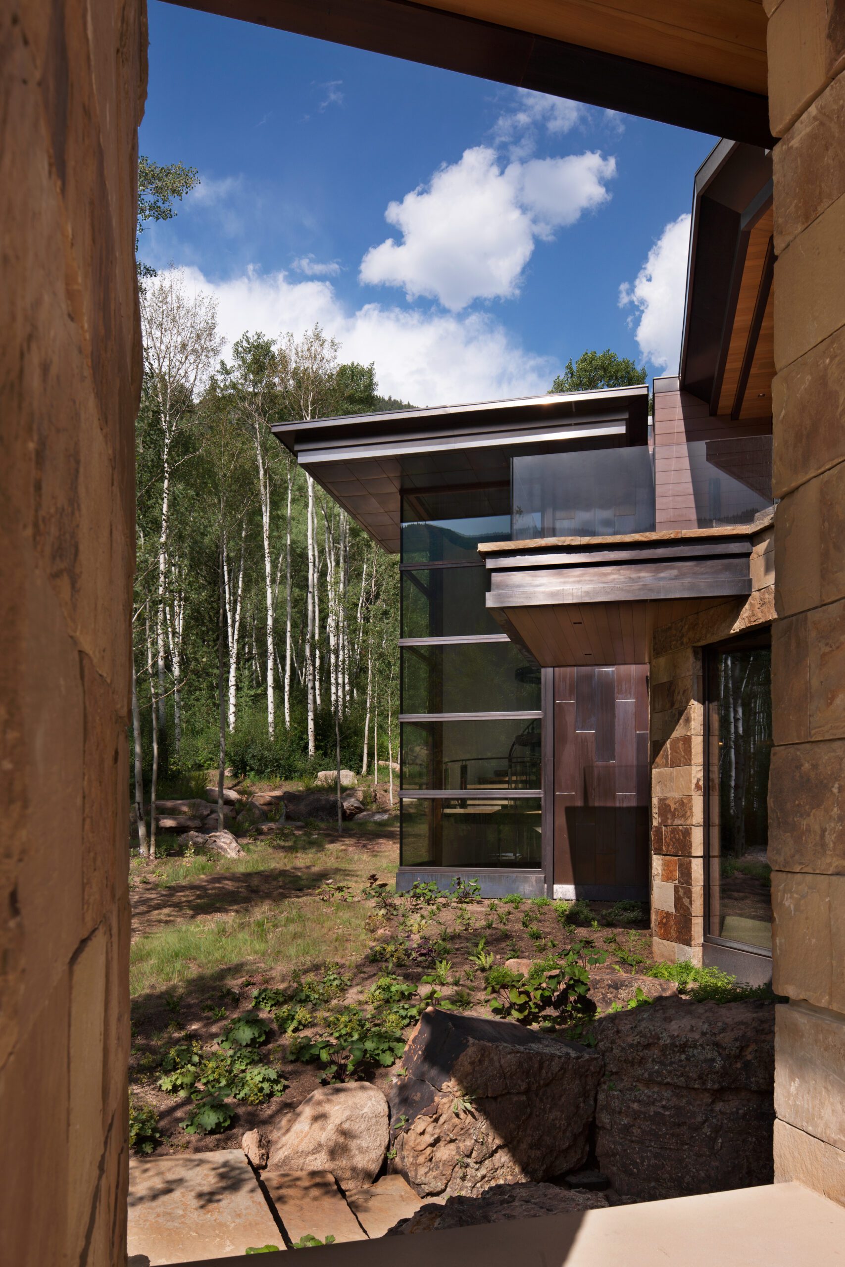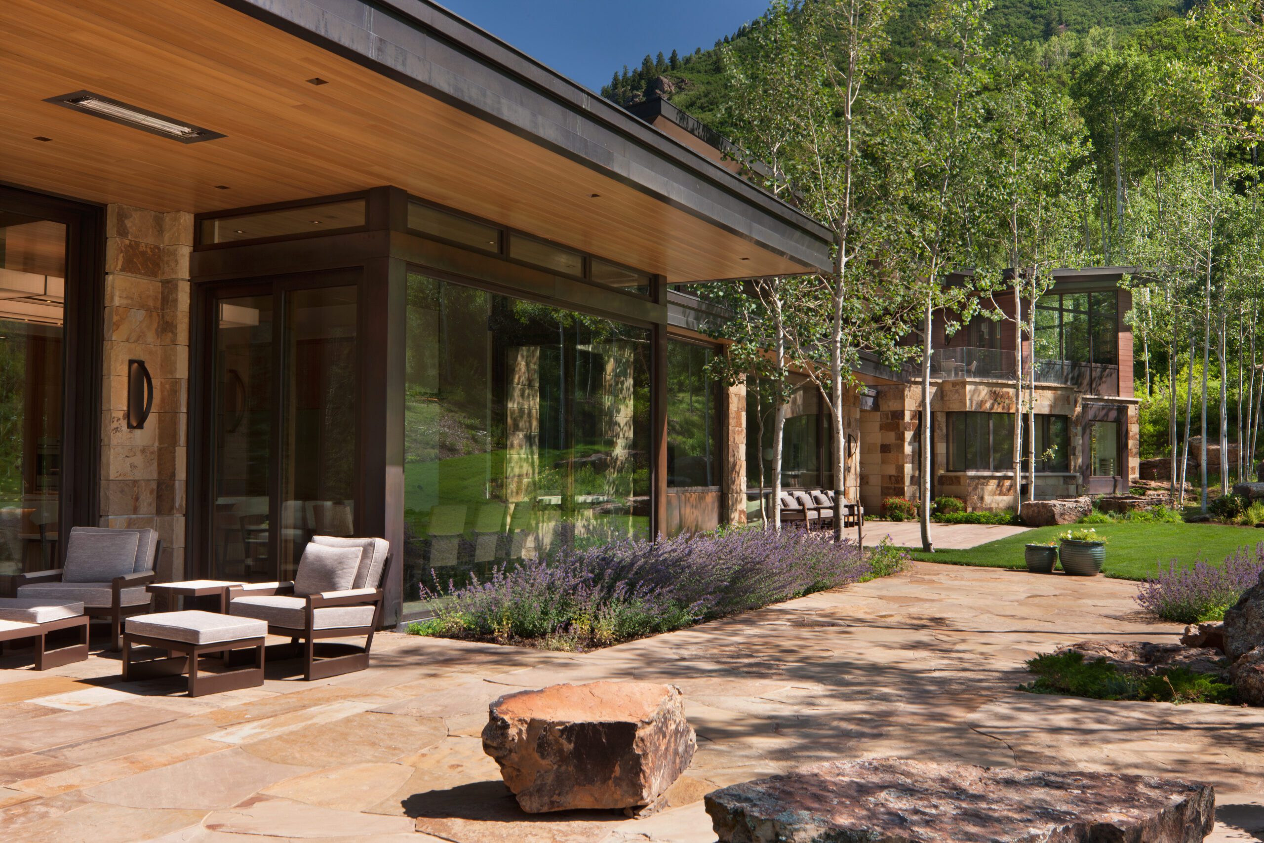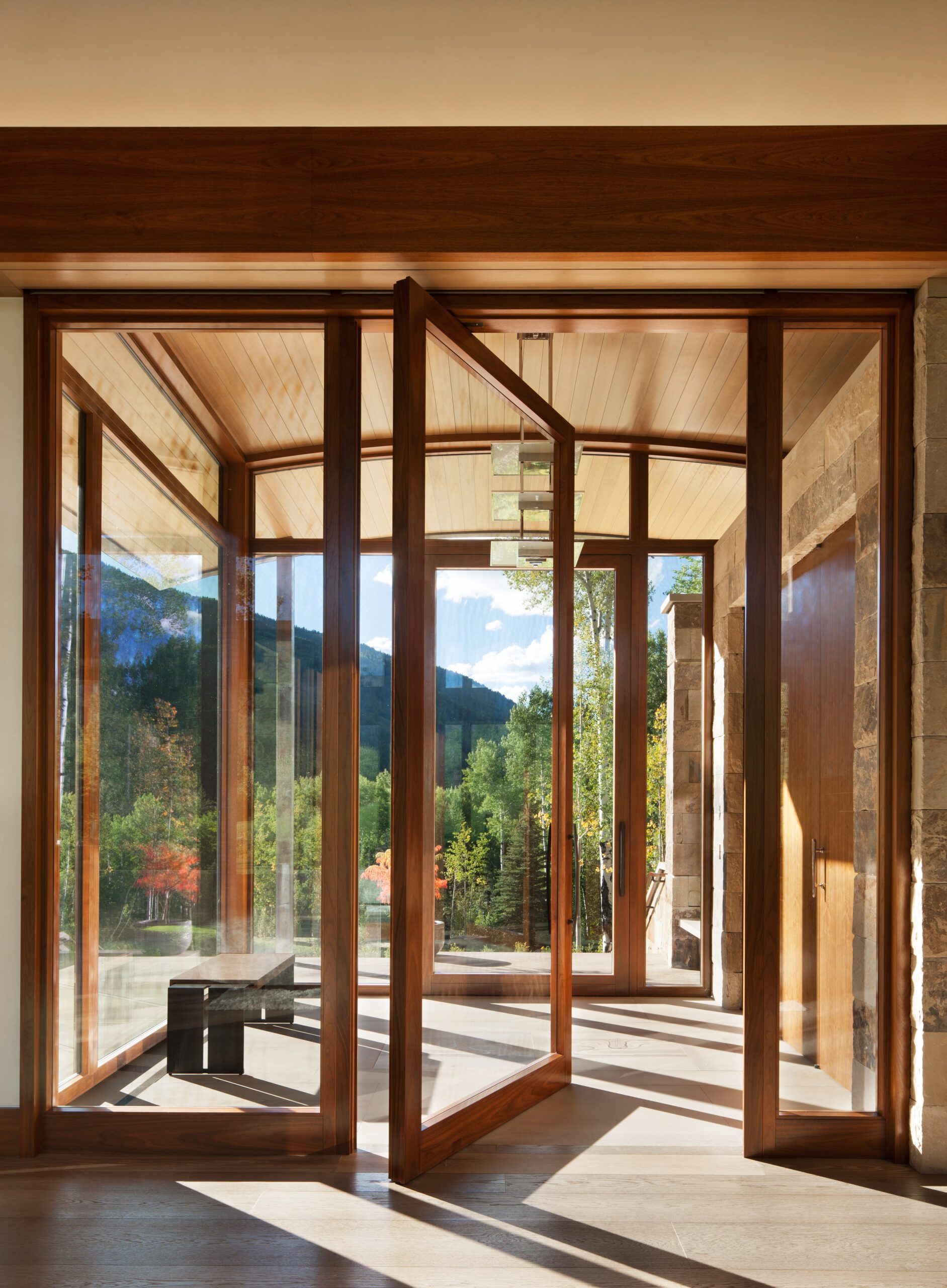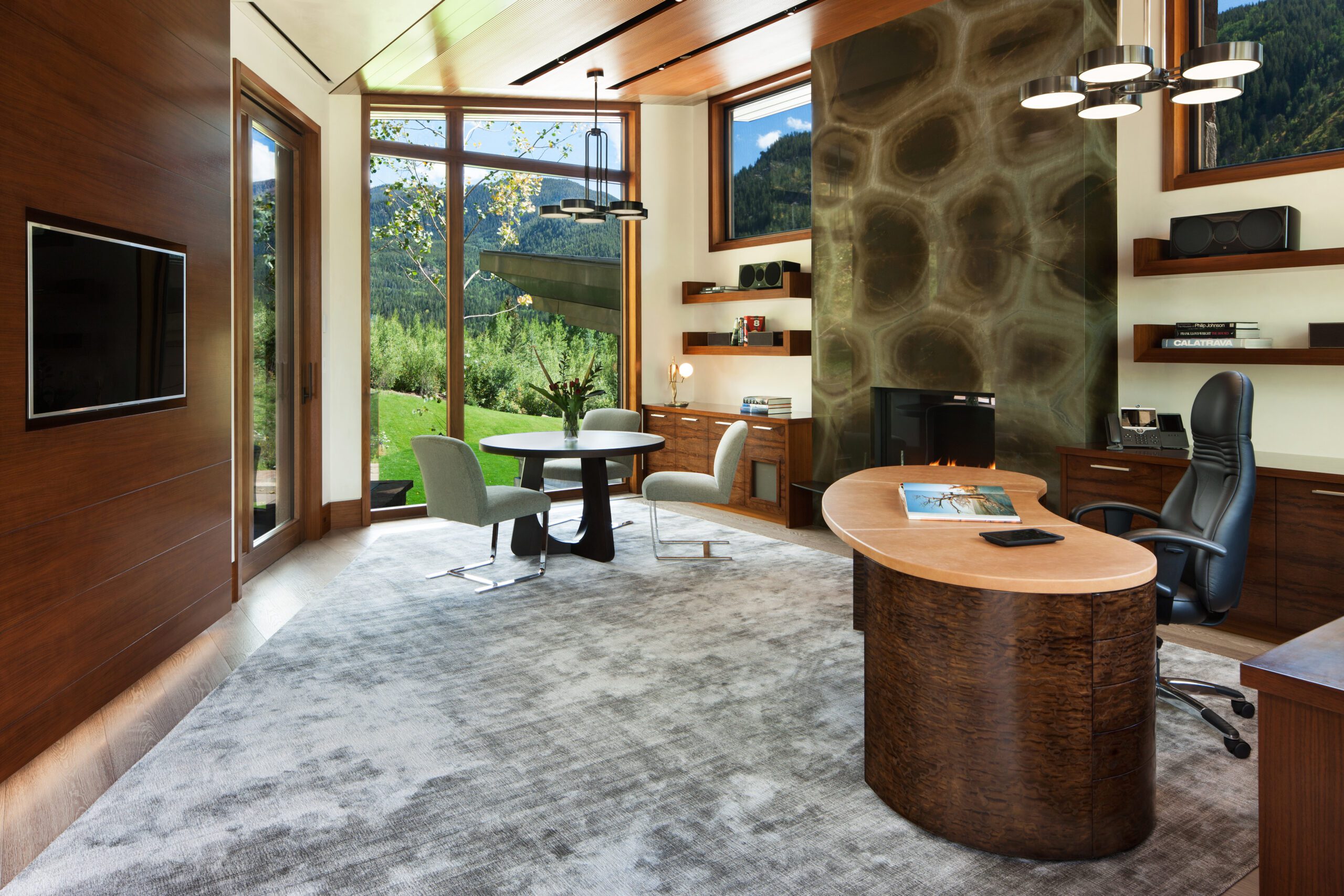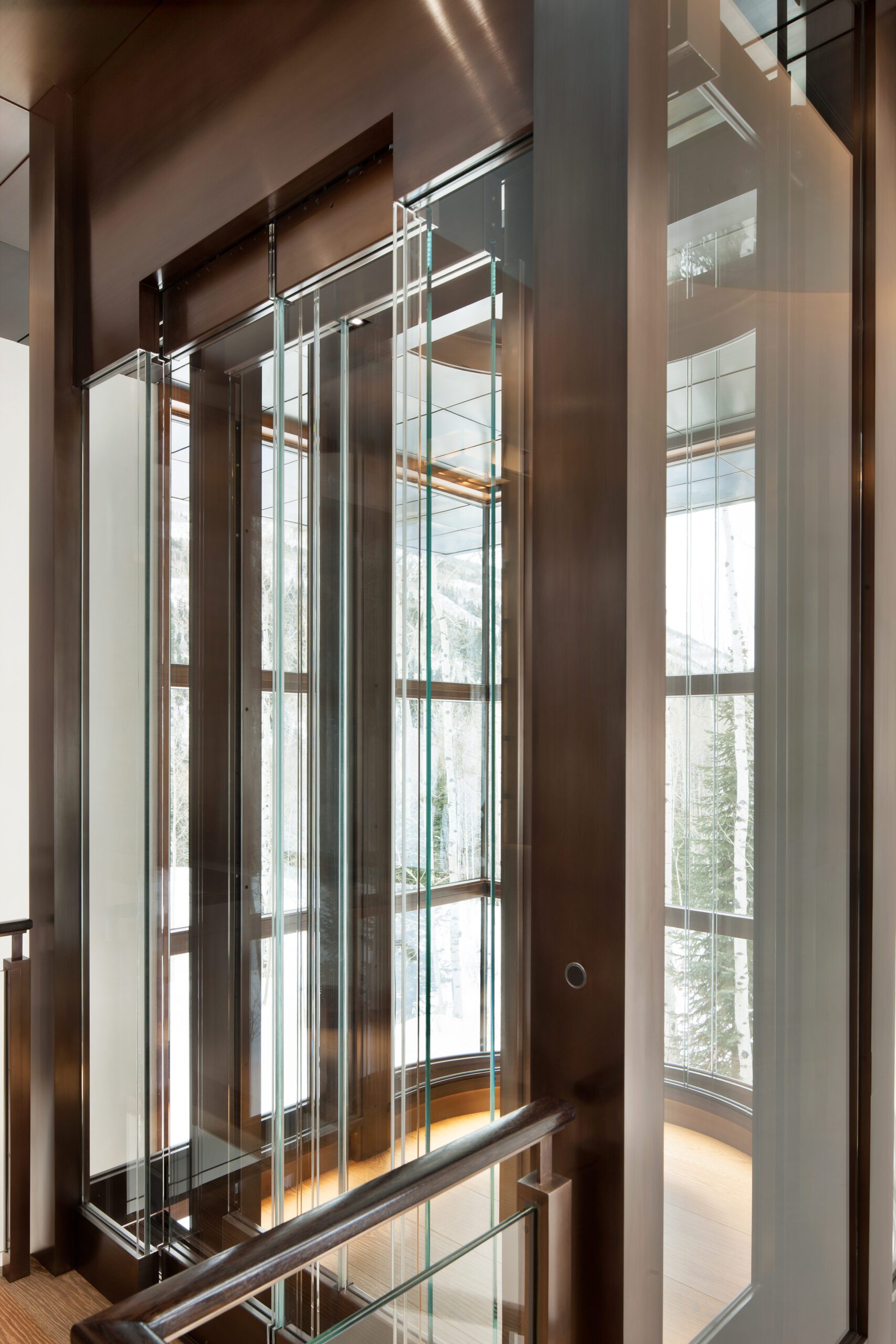 Project Information: The 15,000 SF main residence is built into the South Aspen hillside. It boasts exceptional views of Independence Pass and the backside of Aspen Mountain. The adjoining guest lot is parklike with meandering streams and trout-stocked ponds. This art deco-inspired modern retreat was designed by Charles Cunniffe of Aspen, CO. The exterior finishes include solid walnut windows and doors cladded in true bronze. The rainscreen consists of a composite material made from rice husks, and the stone veneer is dimensionally-cut Oklahoma brown fieldstone. The wood-like swirled sandstone that carefully dresses the expansive entry is cut from large boulders sourced out of the Ozark Mountains. The interior finishes include patinaed stainless steel accents throughout with wide plank wire-brushed and waxed oak flooring. There are 36 different wood species throughout including rare East Indian rosewood, cathedral-cut walnut, silver-dyed lacewood, ribbon sapele, palladium leaf, ebony, and even white walnut. The two custom stainless and curved glass elevators are the show pieces of the residence, each traveling a single floor via a stainless steel hydraulic piston that comes out of the ground. The fireplaces are 350,000 BTU custom stainless burners with traditional masonry flue assemblies. The landscape includes over an acre of fish-stocked ponds and meandering streams.