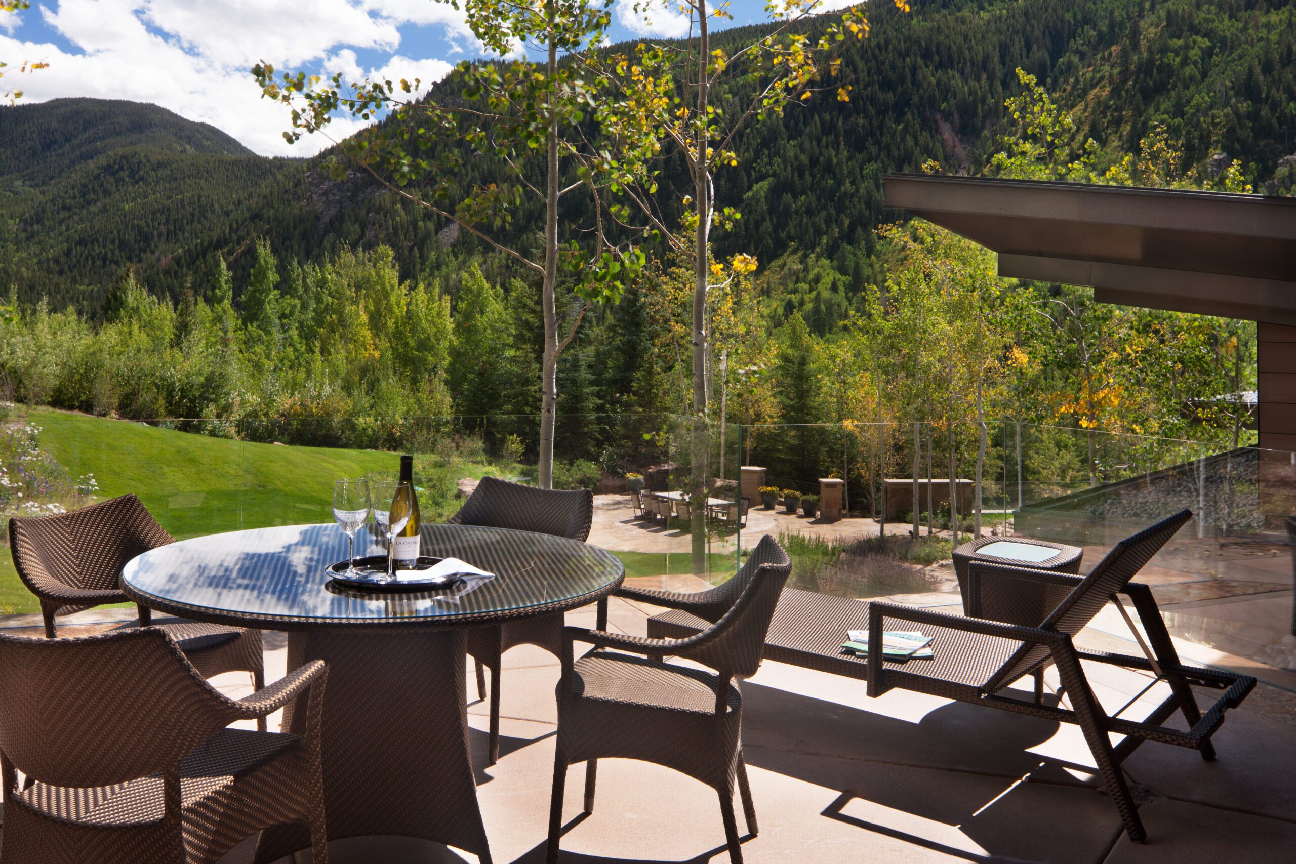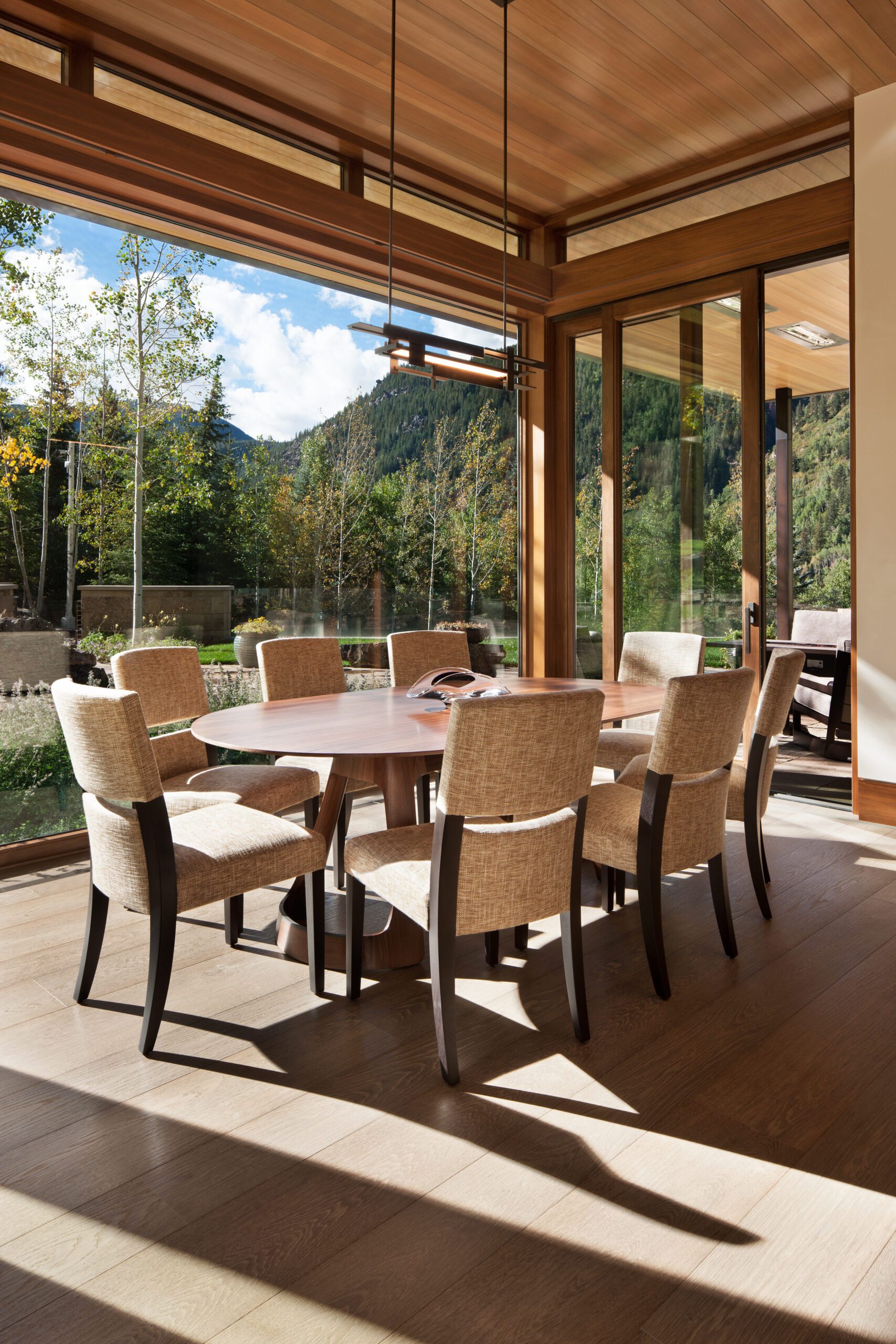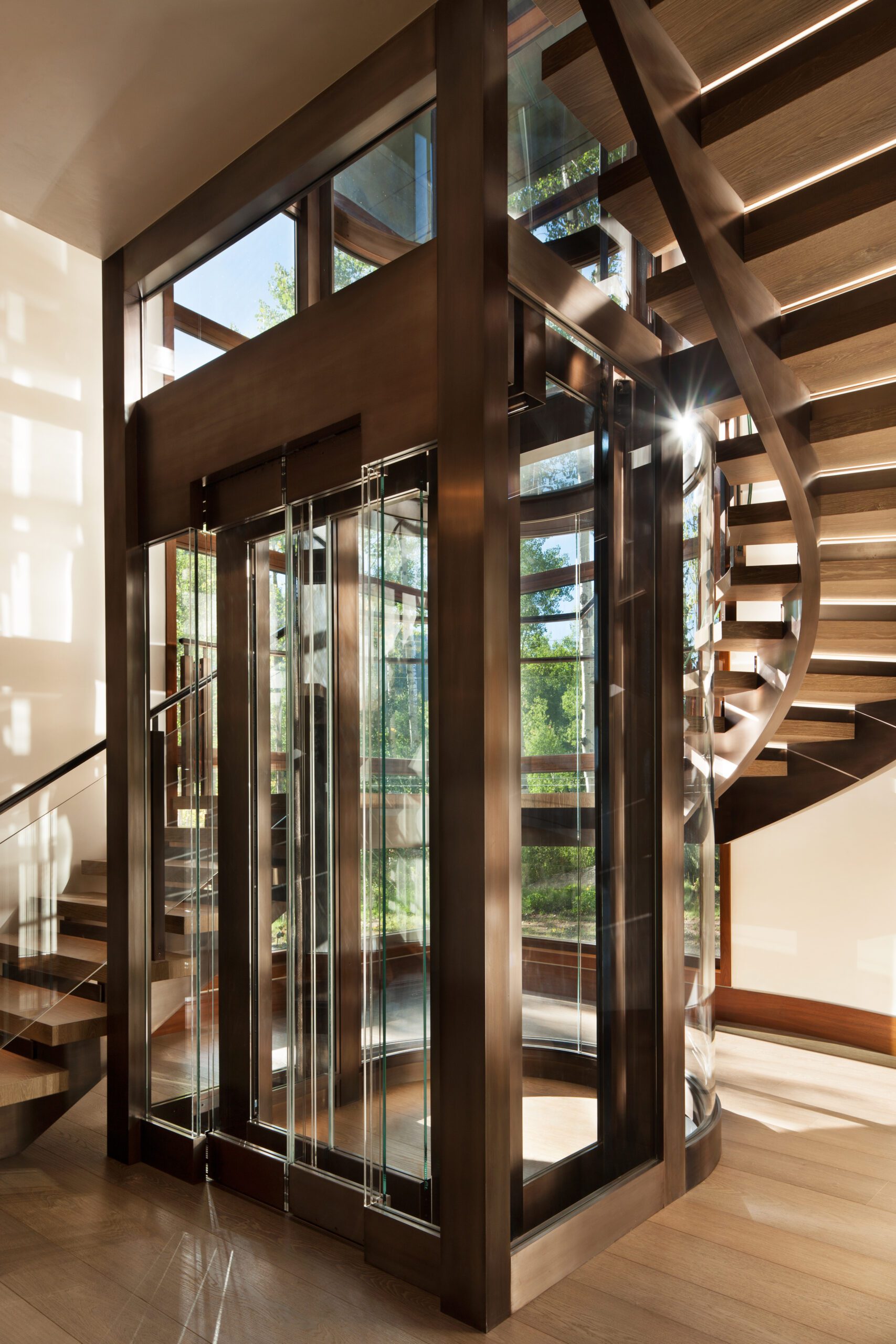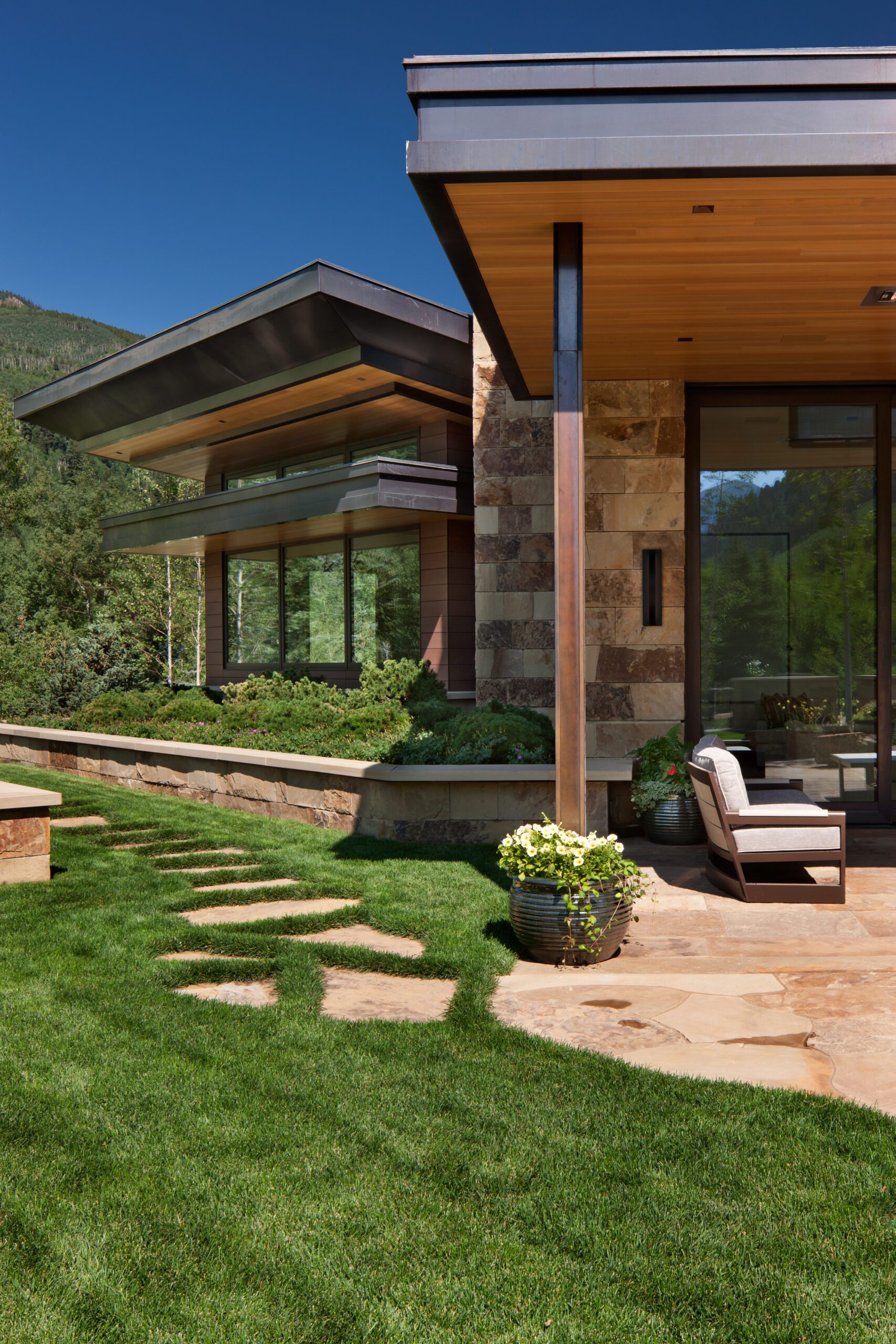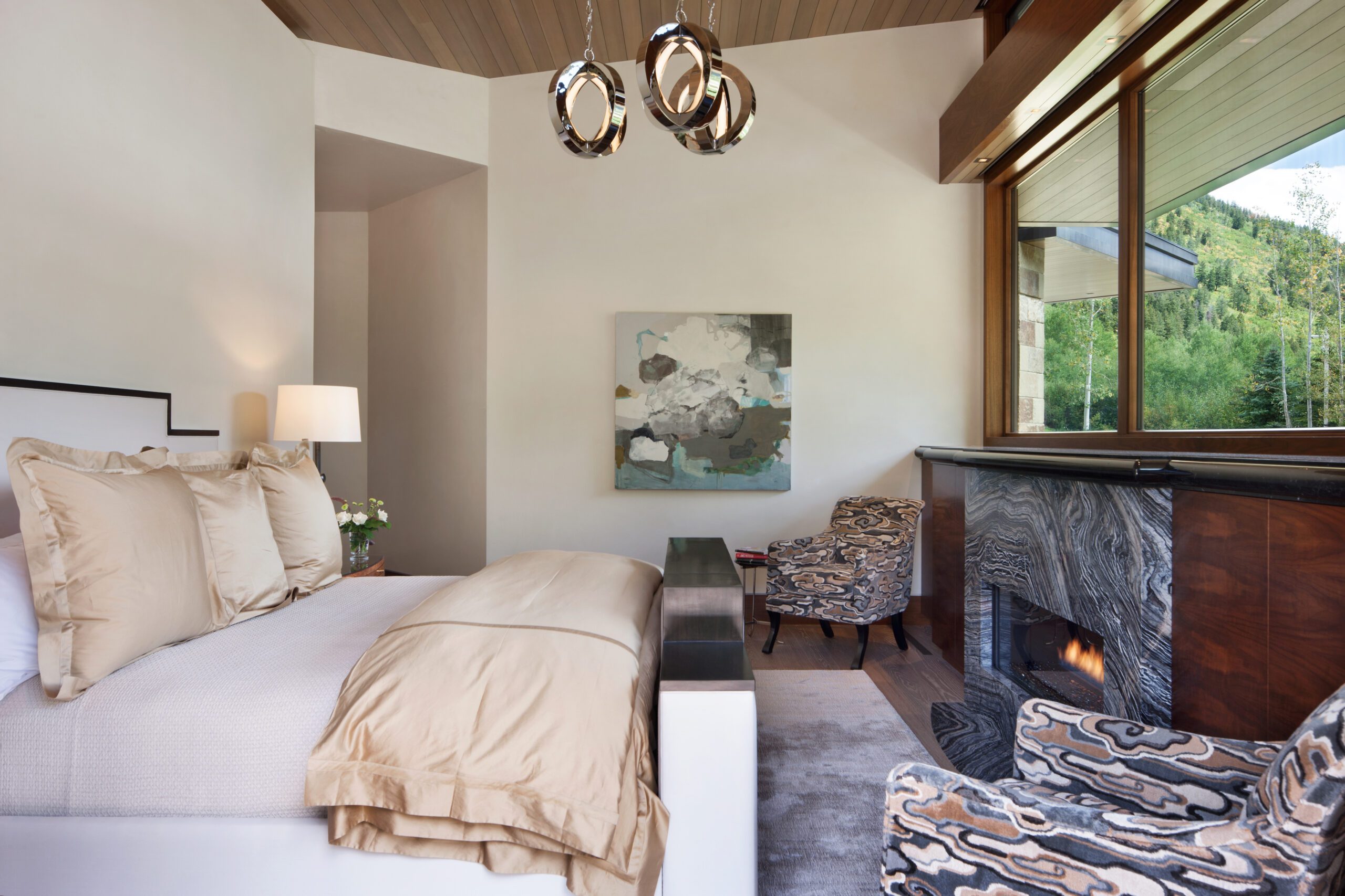 Project Information: The 15,000 SF main residence is built into the South Aspen hillside. It boasts exceptional views of Independence Pass and the backside of Aspen Mountain. The adjoining guest lot is parklike with meandering streams and trout-stocked ponds. This art deco-inspired modern retreat was designed by Charles Cunniffe of Aspen, CO. The exterior finishes include solid walnut windows and doors cladded in true bronze. The rainscreen consists of a composite material made from rice husks, and the stone veneer is dimensionally-cut Oklahoma brown fieldstone. The wood-like swirled sandstone that carefully dresses the expansive entry is cut from large boulders sourced out of the Ozark Mountains. The interior finishes include patinaed stainless steel accents throughout with wide plank wire-brushed and waxed oak flooring. There are 36 different wood species throughout including rare East Indian rosewood, cathedral-cut walnut, silver-dyed lacewood, ribbon sapele, palladium leaf, ebony, and even white walnut. The two custom stainless and curved glass elevators are the show pieces of the residence, each traveling a single floor via a stainless steel hydraulic piston that comes out of the ground. The fireplaces are 350,000 BTU custom stainless burners with traditional masonry flue assemblies. The landscape includes over an acre of fish-stocked ponds and meandering streams.