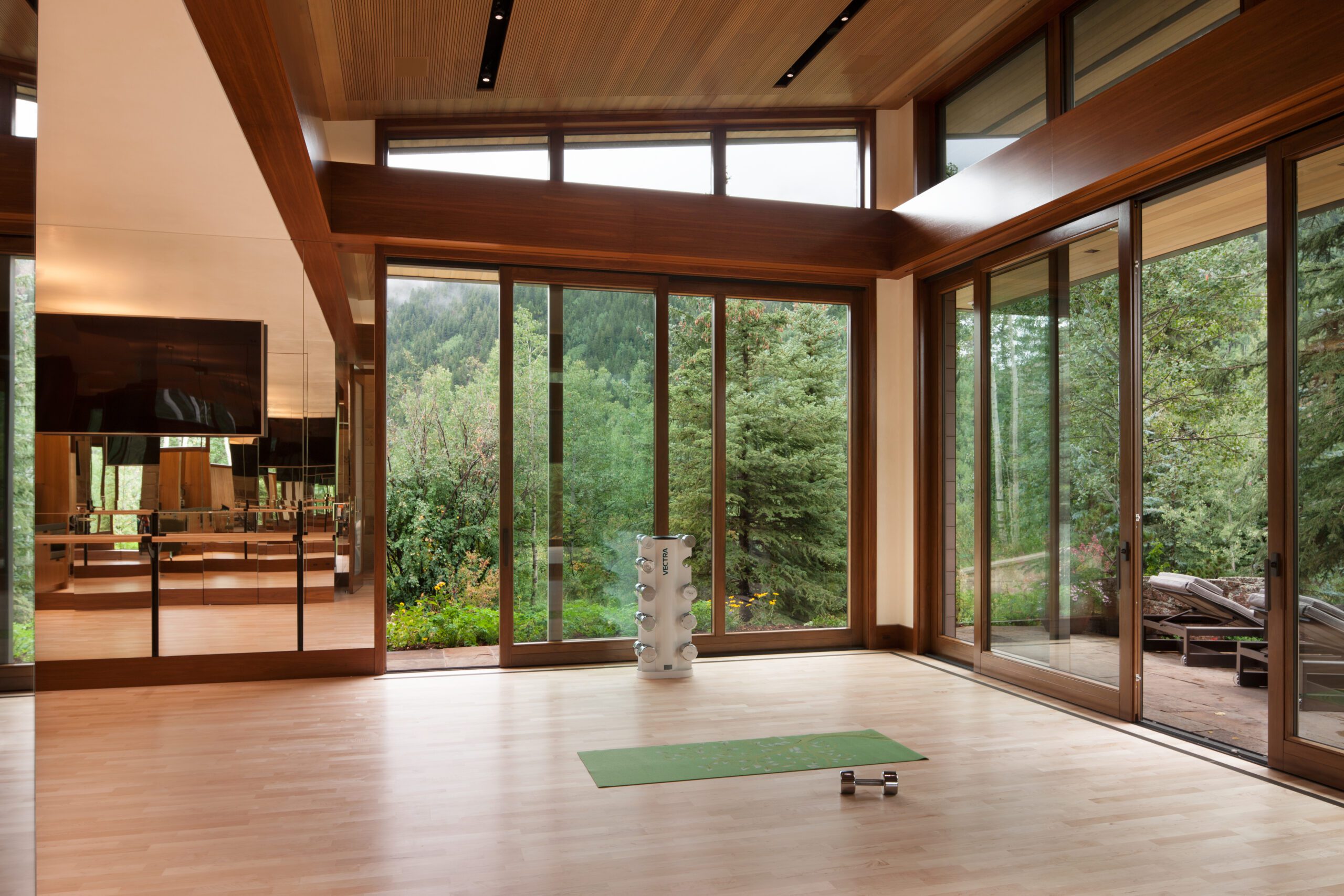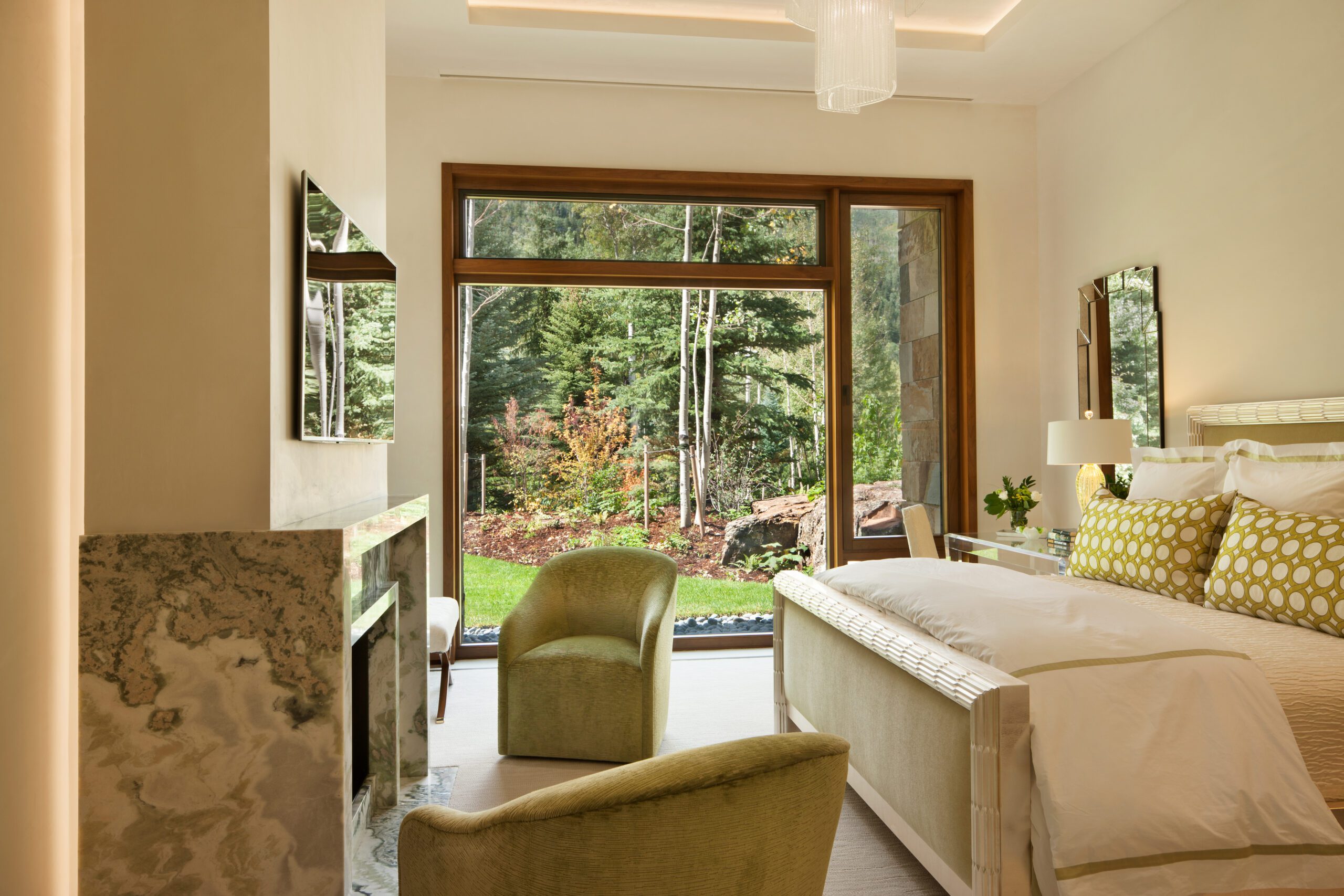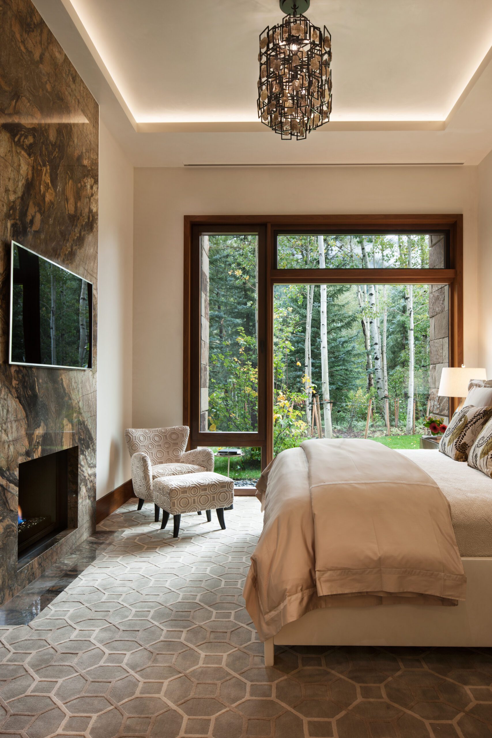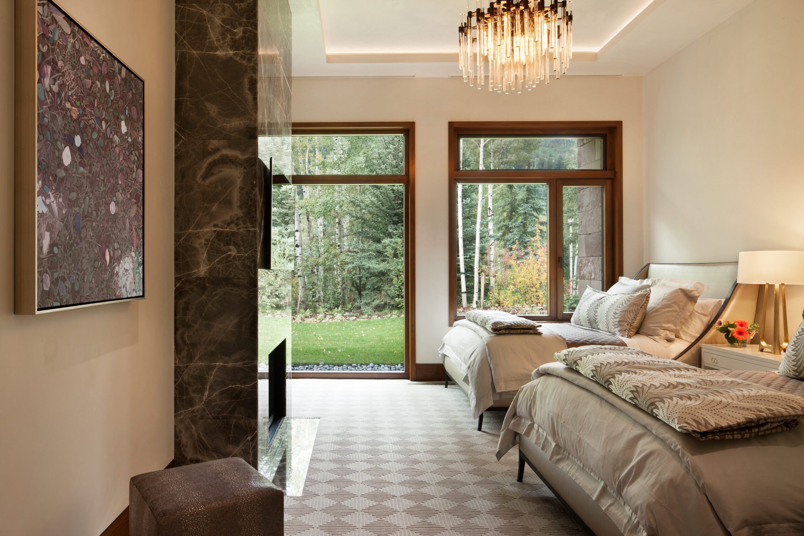 Project Information: The 15,000 SF main residence is built into the South Aspen hillside. It boasts exceptional views of Independence Pass and the backside of Aspen Mountain. The adjoining guest lot is parklike with meandering streams and trout-stocked ponds. This art deco-inspired modern retreat was designed by Charles Cunniffe of Aspen, CO. The exterior finishes include solid walnut windows and doors cladded in true bronze. The rainscreen consists of a composite material made from rice husks, and the stone veneer is dimensionally-cut Oklahoma brown fieldstone. The wood-like swirled sandstone that carefully dresses the expansive entry is cut from large boulders sourced out of the Ozark Mountains. The interior finishes include patinaed stainless steel accents throughout with wide plank wire-brushed and waxed oak flooring. There are 36 different wood species throughout including rare East Indian rosewood, cathedral-cut walnut, silver-dyed lacewood, ribbon sapele, palladium leaf, ebony, and even white walnut. The two custom stainless and curved glass elevators are the show pieces of the residence, each traveling a single floor via a stainless steel hydraulic piston that comes out of the ground. The fireplaces are 350,000 BTU custom stainless burners with traditional masonry flue assemblies. The landscape includes over an acre of fish-stocked ponds and meandering streams.