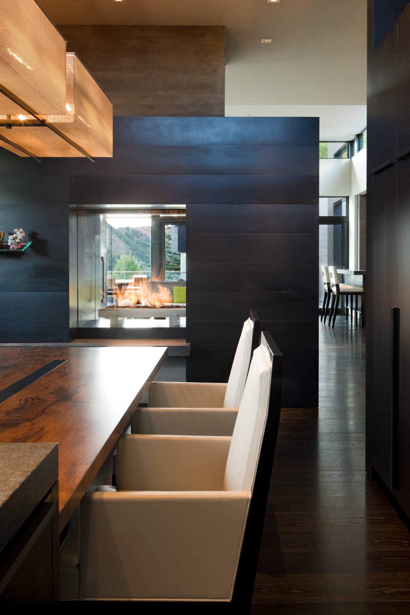 Project Information: The residence is a 7,500 SF contemporary home constructed out of board-formed architectural concrete. This material selection provides the home with a sense of permanence, while the wire-brushed boards used in their construction provide for the softer feel of real wood. The charcoal-colored rainscreen consists of a maintenance-free, integral colored recycled fiber. The windows, the channel fascia, and the trellis are all painted carbon steel with custom glazing. The stainless steel fire features and integrated infrared heaters provide for another 2,000 SF of three-season outdoor living spaces. The interior monochromatic tone provides the perfect backdrop for the owners’ amazing art collection. The four-story stair stringers consist of three pieces of waxed carbon steel seamlessly welded with an integral glass shoe. The millwork is made from wenge mixed with both carbon and stainless steel accents. Absolute black granite covers the entry and exterior patios as well as interior countertops.